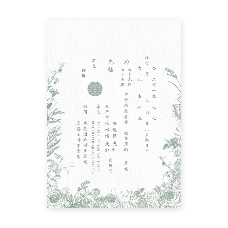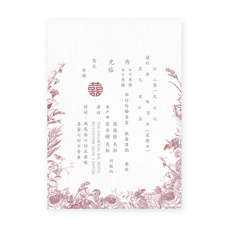 SPECIFICATIONS FOR MANDARIN INVITATIONS Size of card is 135 x 190mm Print Method: Digital Print, Single Side Material:FSC certified 300gsm card stock.