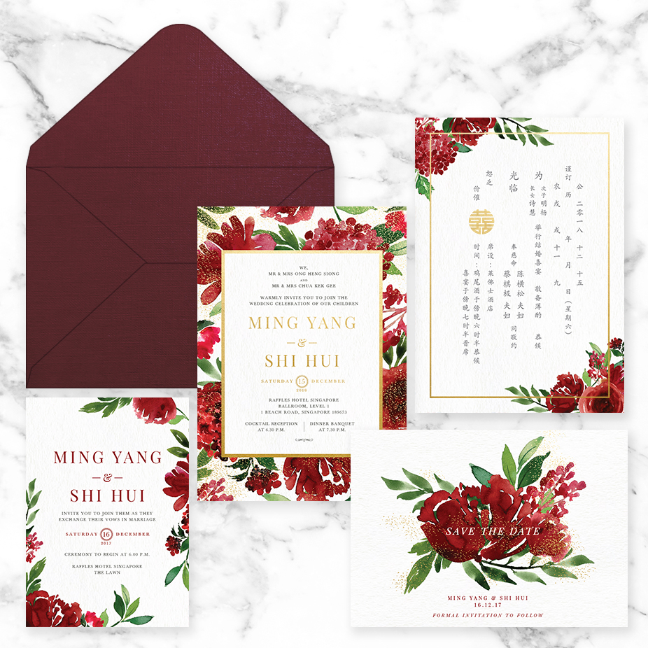 Make it official by sending a wedding announcement card (to proclaim your nuptials!) together with a specially curated gift set to your nearest and dearest. We have collaborated with a few of our favourite Singapore brands to put together these elegant gift sets that are bound to impress your recipients. From sweet treats from Fossa Chocolate, savoury canapés from Tim's Fine Catering to personalised leather accessories from Rever Goods, there will be something to suit every budget.